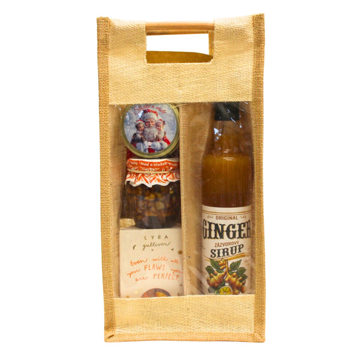 Praktická, pekná a nadčasová jutová taška so skvelými produktmi vo vnútri.