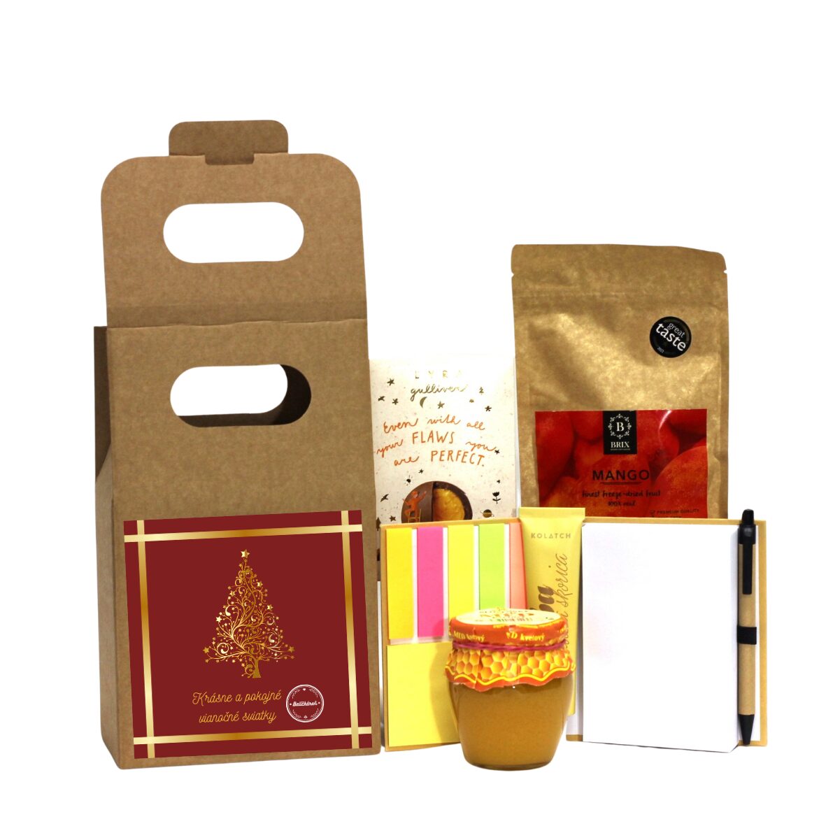 Mrazom sušené mango Brix 30g, Kvetový med 250g, LYRA Gulliver mango 100g, TUBA Kolatch mandle a škorica 45g, Poznámkový blok so samolepiacimi bločkami a perom